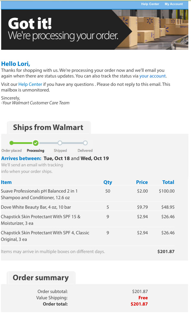 walmartorderconfirm Previous Next Published October 12, 2016 at 643 × 1050 in Items for First 50 Refresh Bags Ordered!