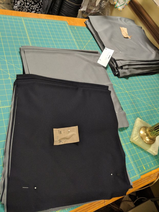 My oldest son and I folded and pinned the bags to prepare them to be serged.