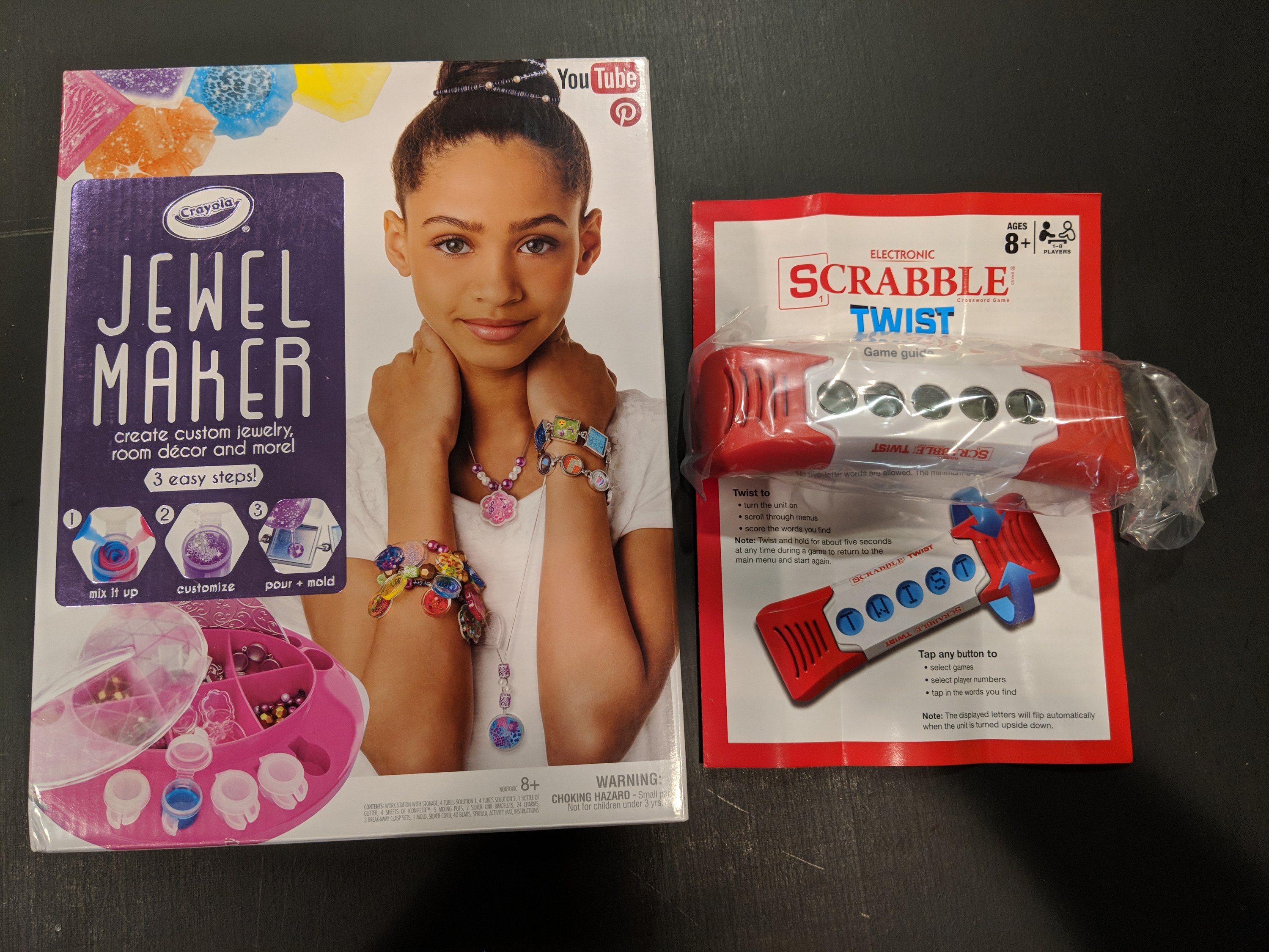 - Something fun (Scrabble Twist, Playing Cards, Jewelry Making Kit, Journal with multi-colored Pen, Nail Polish, etc.)