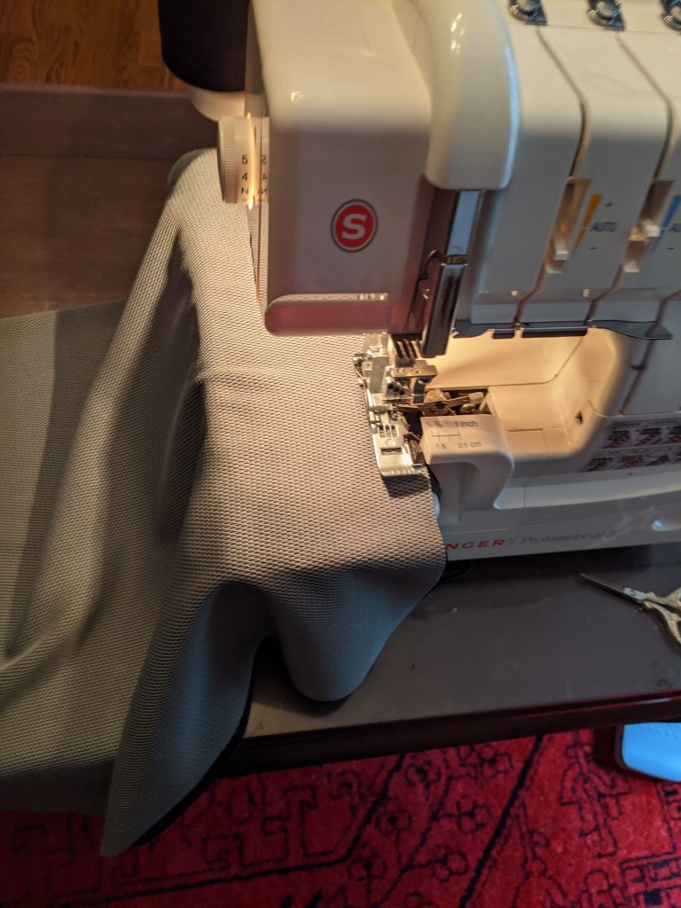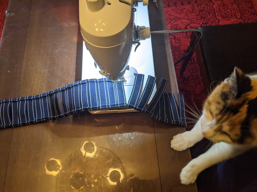 Attempted buttonhole. It’s like an embroidered design. The tread was getting tangled in the bobbin’s inner workings and the feed dogs. The machine was a Singer Heavy Duty machine, but it’s really more of a lightweight heavy-duty machine.